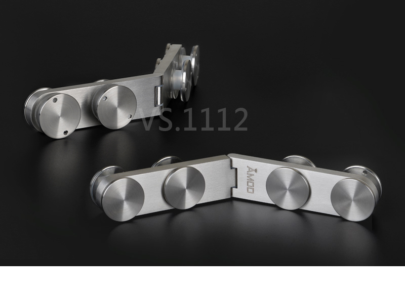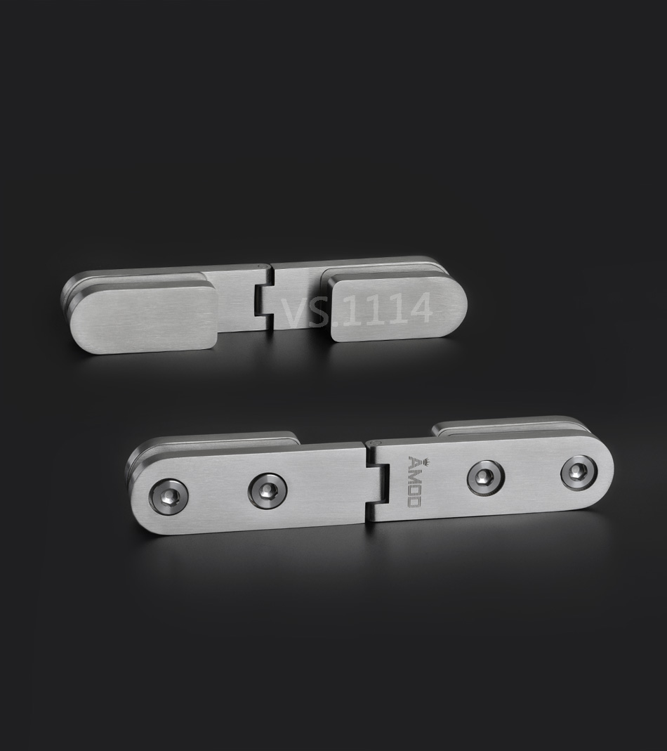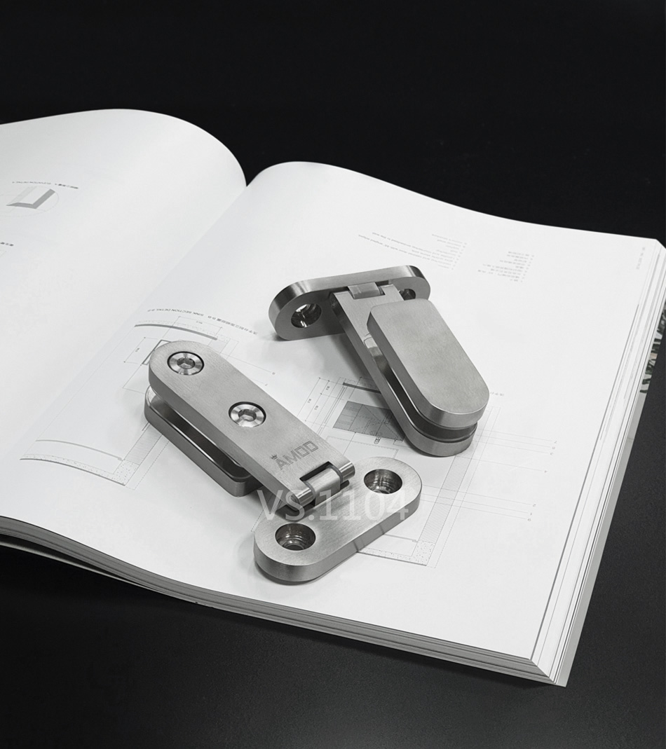 Volkslime玻對玻鉸鏈,秉持AMOD一貫的純鋼材結構設計,即便是細微如螺絲蓋,均採用純304不鏽鋼加工而成,表面覆以手工髮絲紋路。Volkslime鉸鏈同時提供平頭夾及漏斗夾玻璃夾頭,對應8~10mm 厚度玻璃使用。