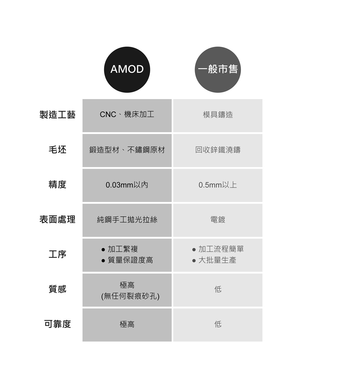 如同AMOD一貫的加工及用料,Roundie系列所有組件均為純鋼料、CNC加工完成,讓日常的基本清潔維護工作更為輕鬆。