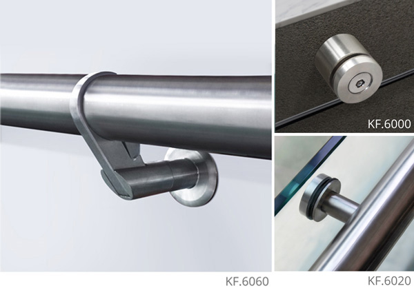 Knopeli系列成功地將不鏽鋼的堅固特質延伸到室內階梯設計上。藉由精拋光的實心不鏽鋼玻璃夾具,配合精緻的特殊固定螺絲,搭配以玻璃為介面,簡潔而富現代感,顛覆傳統階梯扶手呆板造型。