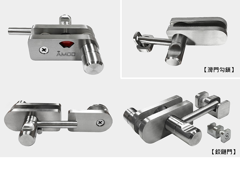 為了確保製造精度及品質要求,大量使用CNC加工流程,以及100%以工匠手工拋光、拉絲紋的外觀完成工序,成為區別AMOD產品與一般模具鑄造、電鍍所生產的五金最顯著差異。扣鎖系列區分鉸鏈門及橫拉門專用形式,為充滿機械感又不失精緻的玻璃門片五金配件。