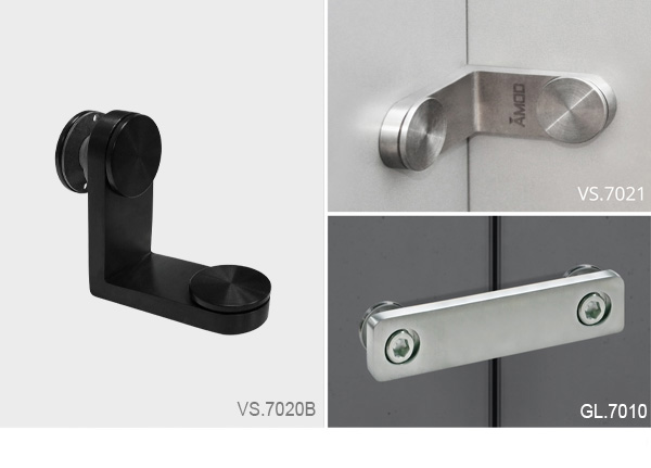 Volkslime玻對玻鉸鏈,秉持AMOD一貫的純鋼材結構設計,即便是細微如螺絲蓋,均採用純304不鏽鋼加工而成,表面覆以手工髮絲紋路。Volkslime鉸鏈同時提供平頭夾及漏斗夾玻璃夾頭,對應8~10mm 厚度玻璃使用。